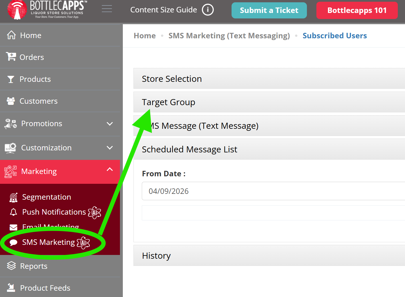 SMS (text messaging) is very similar. Click SMS MARKETING on the left menu and then TARGET GROUP ...