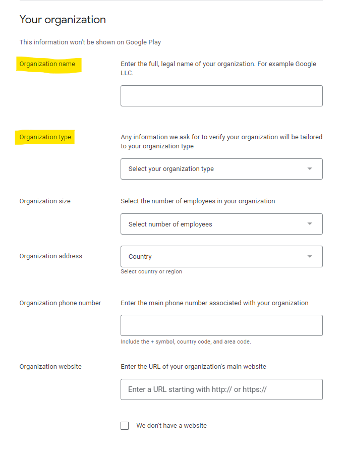 The next few steps will ask you a list of questions about your business and your history using Google Play.