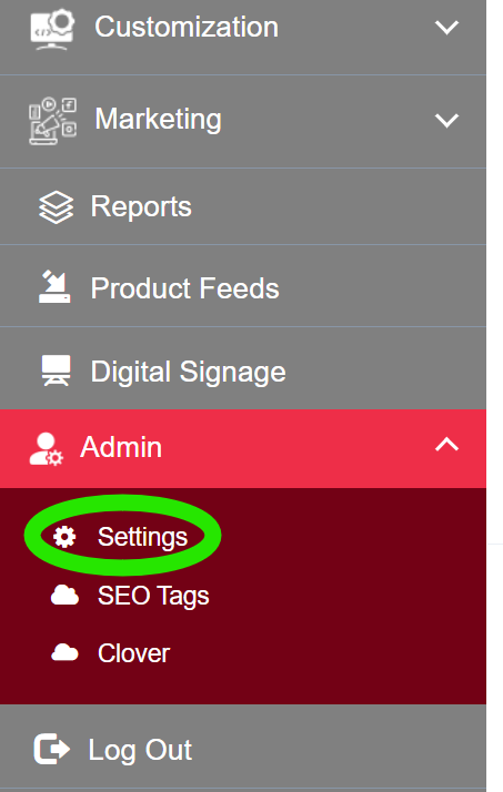 To adjust the ordering settings you want to offer during HOLIDAYS, click Admin, then Settings on the lower left of your Webconsole.
