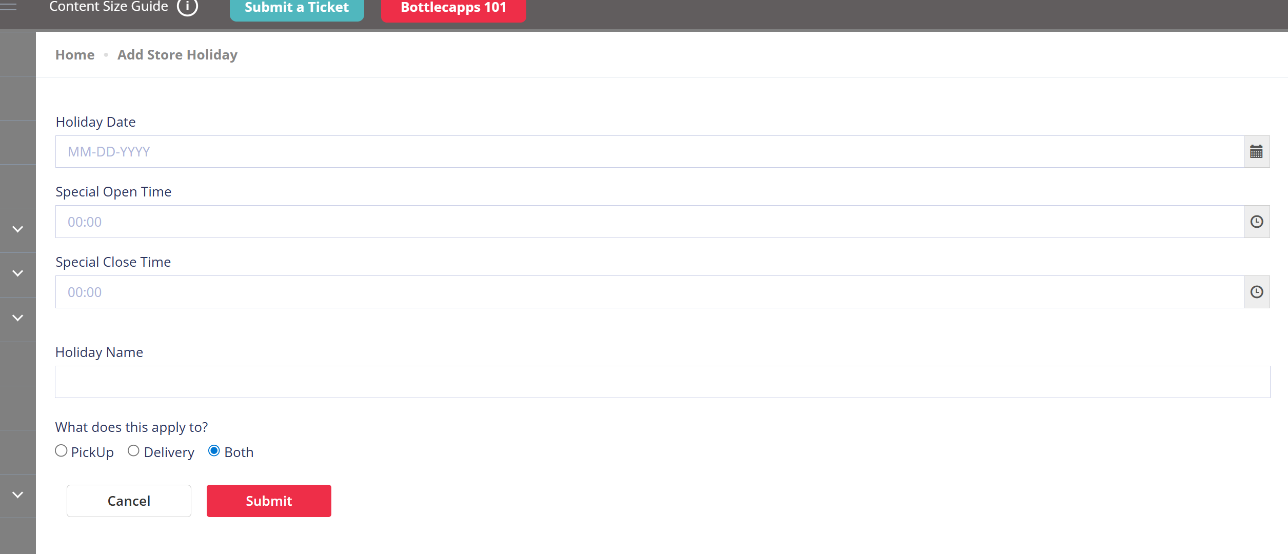 From there, simply enter the appropriate information (Date, Special Open/Close Time, Name of Holiday). You can disable Pickup, Delivery, or Both. Once done, click Submit: