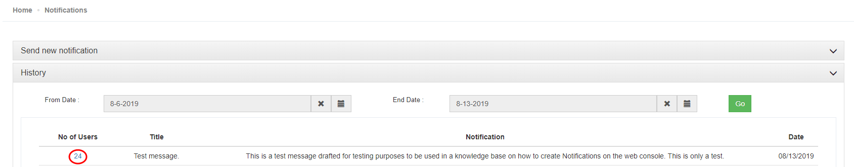 When you send out a notification, you will see an entry under the History tab. This will give details such as the number of users the message has been sent to,